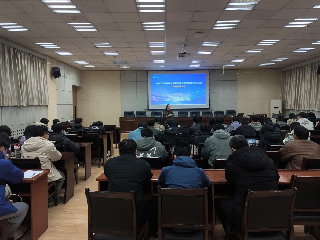 按照学校研究生工作部关于2025年研究生学风建设暨学术文化活动月的安排部署,12月16日-23日,电子工程学院2025年研究生学风建设暨学术文化月之研究生学术论坛在雁塔校区会议中心第三会议室顺利举行。学院副院长杨一、研究生辅导员李君、王晓天以及各年级研究生代表参会,我院11位研究生代表作专题学术汇报。