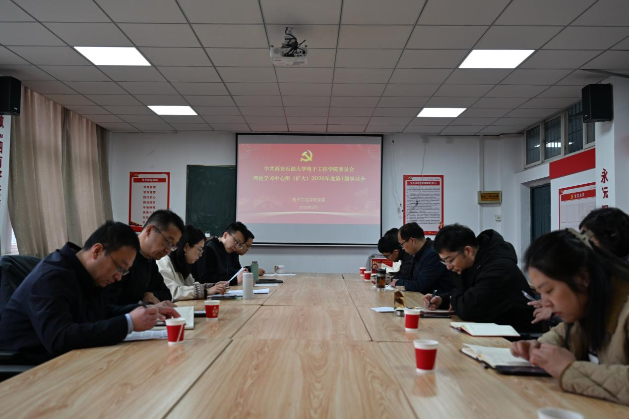 2月27日下午,电子工程学院党委理论学习中心组2026年第1期(扩大)学习会在雁塔校区华油能源楼905会议室召开。学院党委理论学习中心组成员、教师党支部书记和各办公室主任参加会议,会议由学院党委书记潘娜主持。