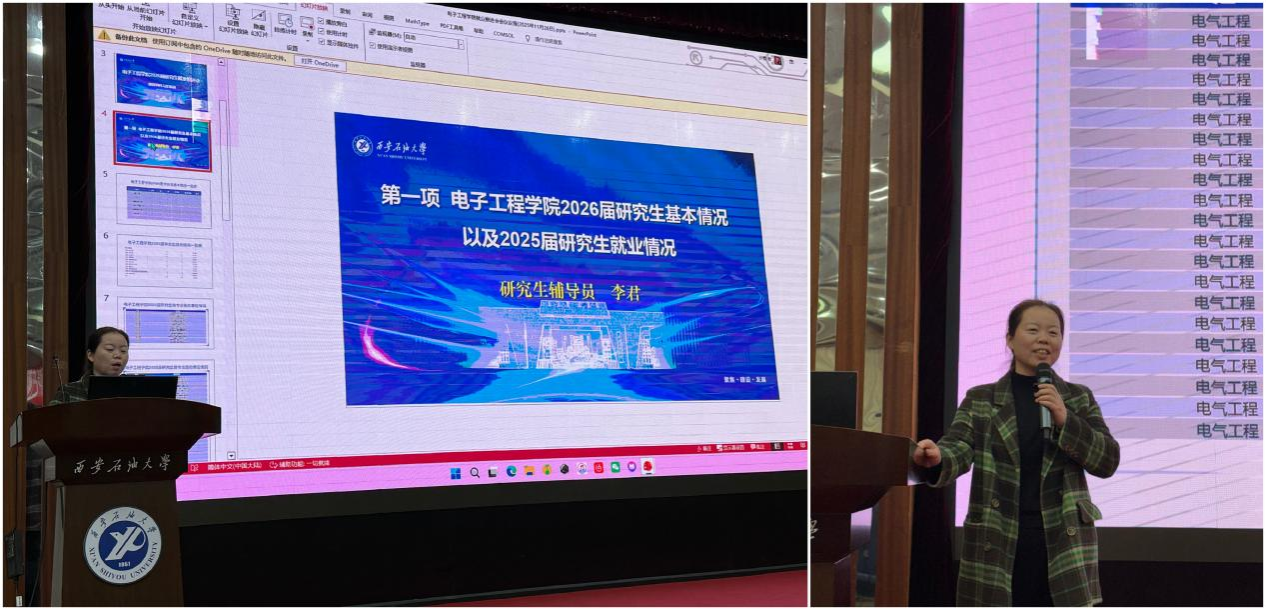 辅导员李君介绍了学院2025届研究生就业情况以及2026届研究生现阶段就业情况,就签约流程、解约流程作了详细讲解。并鼓励同学们要立足专业特色,主动对接“四油一网”行业需求,珍惜每一次求职机会,精准定位自身优势,以积极、从容的心态应对求职挑战,不断提升就业竞争力。学院永远是你们最坚实的后盾,领导、导师和老师们将始终陪伴在你们身边,与大家并肩作战,共同迎接人生的新篇章!
